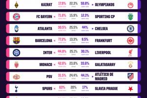 全文摘要:欧冠第6轮开赛,opta预测拜仁、巴萨主场胜率超70%。焦点战中,国米对利物浦胜率44.8%,略占优势;亚特兰大对切尔西、埃因霍温对马竞等比赛胜率均未过半,悬念十足。