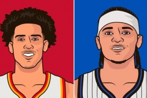 杰伦·约翰逊本赛季场均23.4分10.5板7.9助攻,三项命中率53/40/81%;