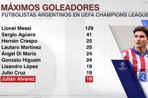 体育资讯12月10日讯 在本轮欧冠马竞3-2击败埃因霍温的比赛中,阿尔瓦雷斯破门。这也是他在欧冠第19球,以下为阿根廷球员在欧冠射手榜: