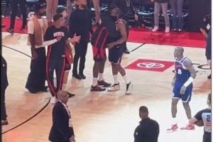 赛后,哈登和火箭球员教练拥抱,其中和卡佩拉拥抱的时间最久。