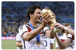 德国队官方社媒晒出胡梅尔斯与大力神杯的合照,配文:“生日快乐,胡梅尔斯!2014年世界杯冠军。”