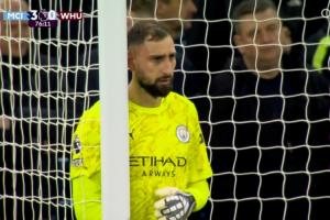 比赛第77分钟,曼城门将多纳鲁马用脸挡出了萨默维尔近距离的打门,随后在防守定位球时特写给到多纳鲁马,他的面部明显出现了被球击中的印记。