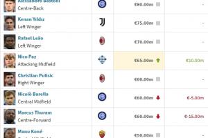 体育资讯12月23日讯 德转今日更新意甲球员身价,劳塔罗最高8500万欧不变,帕斯涨至6500万欧。