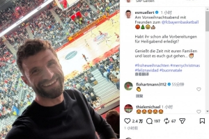穆勒社媒晒出观赛照片,配文:“圣诞节前夕与朋友们一起观看拜仁男篮的比赛🏀🎄😁👍🏼各位都为圣诞夜做好准备了吗?好好享受与家人共度的美好时光,祝大家一切安好。”