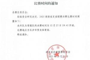 湖南省足球联赛组织委员会发布通知,调整2025湘超决赛比赛时间,永州队与常德队的决赛时间为12月27日19:45开球,比赛地点为长沙市贺龙体育场。
