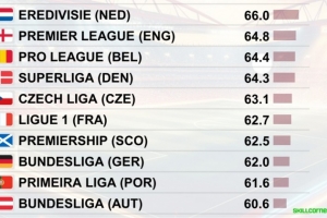 全文摘要:根据CIES数据,在以时速超20公里且持续超1秒为定义的高强度跑动排名中,荷甲球员以66.0的平均值位居榜首,英超以64.8紧随其后,比甲和丹麦超分列三、四位。