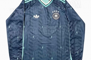 媒体晒出2026年世界杯德国队长袖版客场球衣谍照,这款球衣由阿迪达斯设计,主色调为深海军蓝,领口、袖口、三道杠则为薄荷绿。